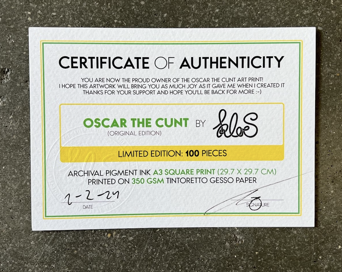 The Oscar the Cunt (Square) by Kloes is a Square print (29.7 x 29.7 cm) printed on 350gsm Tintoresso Gesso Art Paper. Printed in the Netherlands by Mintyfresh. Each print is numbered by hand Read more